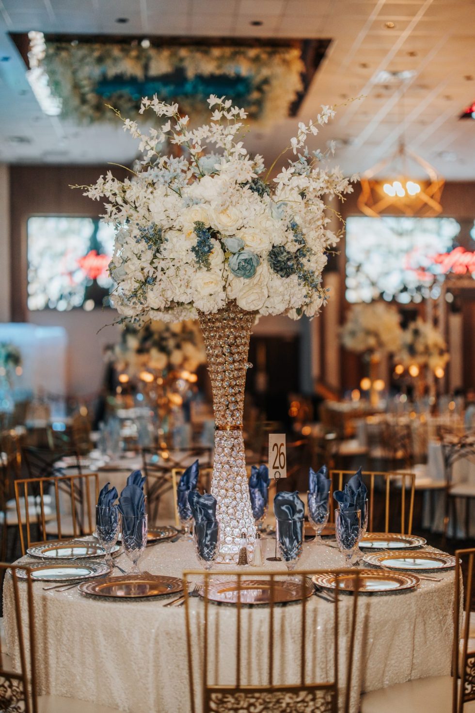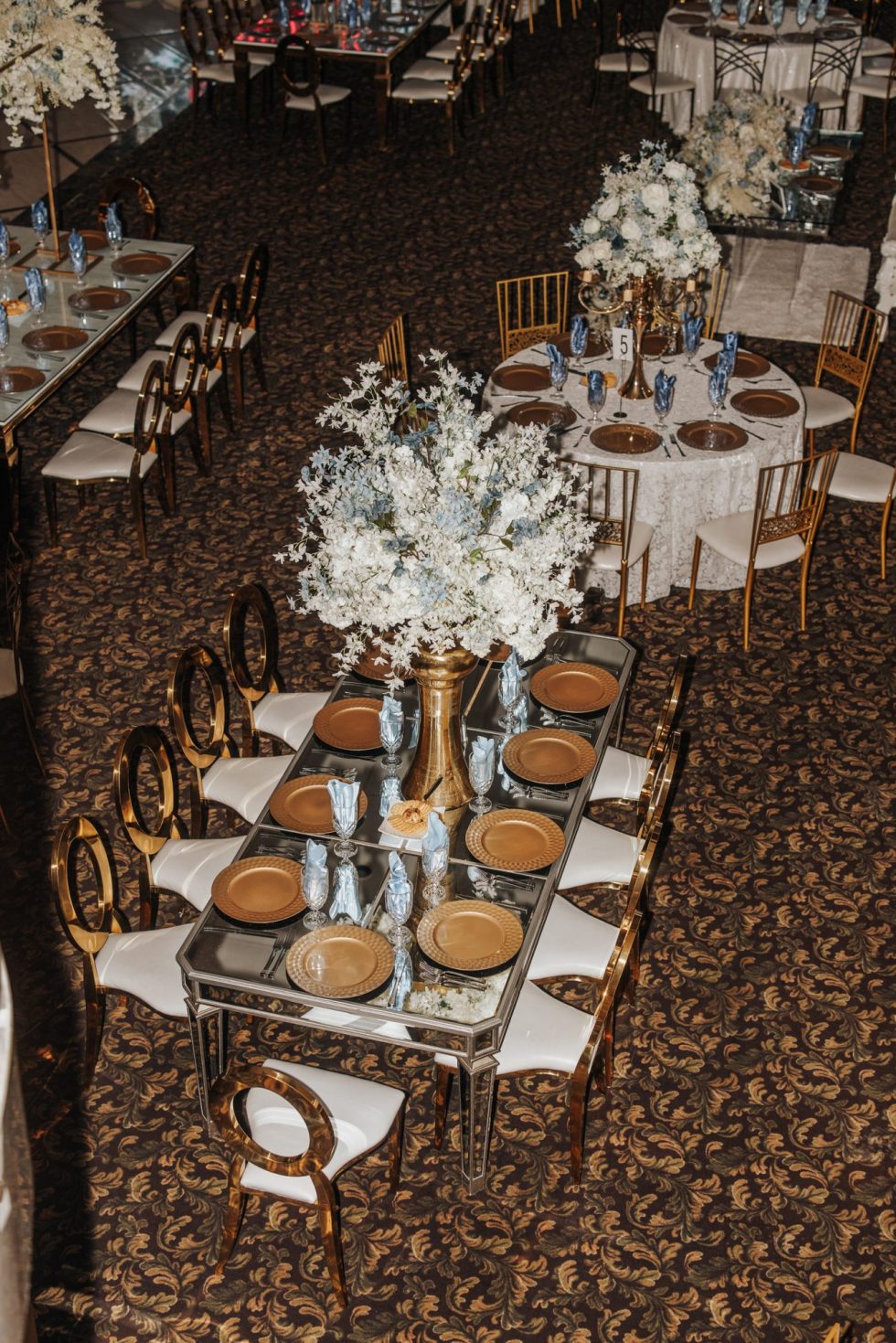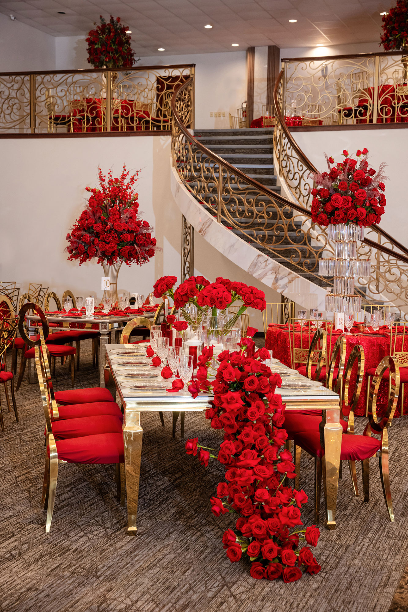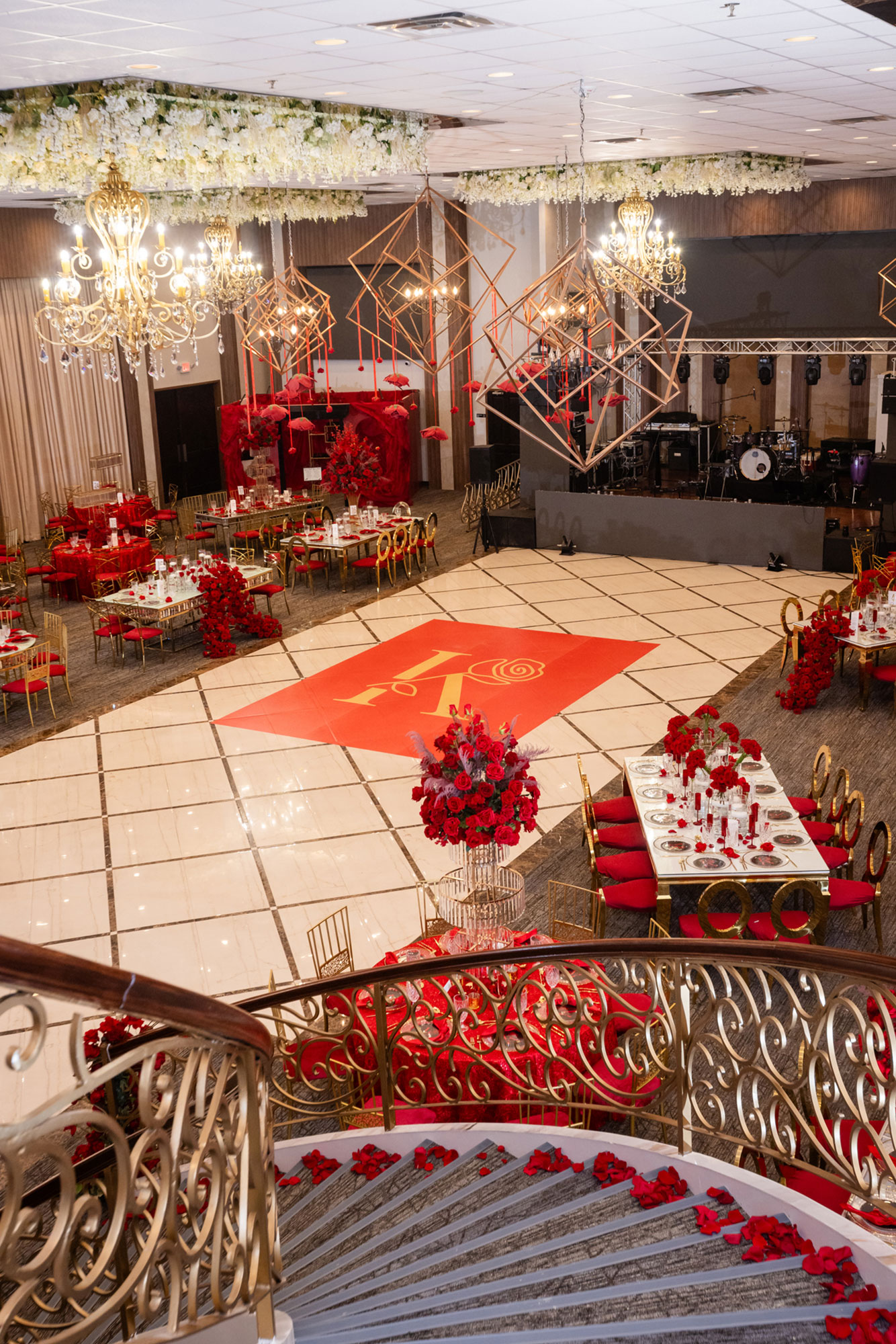 Magnificent crystal chandeliers adorned with cascading decorative flowers illuminate the space, casting a romantic glow over your celebration. The centerpiece of the room is a stunning marble dance floor, surrounded by a spacious seating area that flows seamlessly throughout the ballroom.